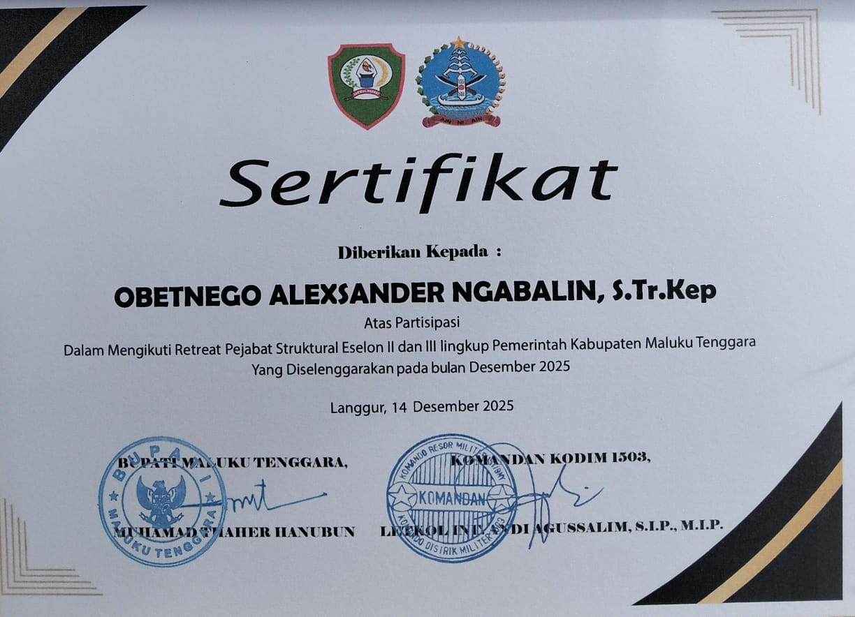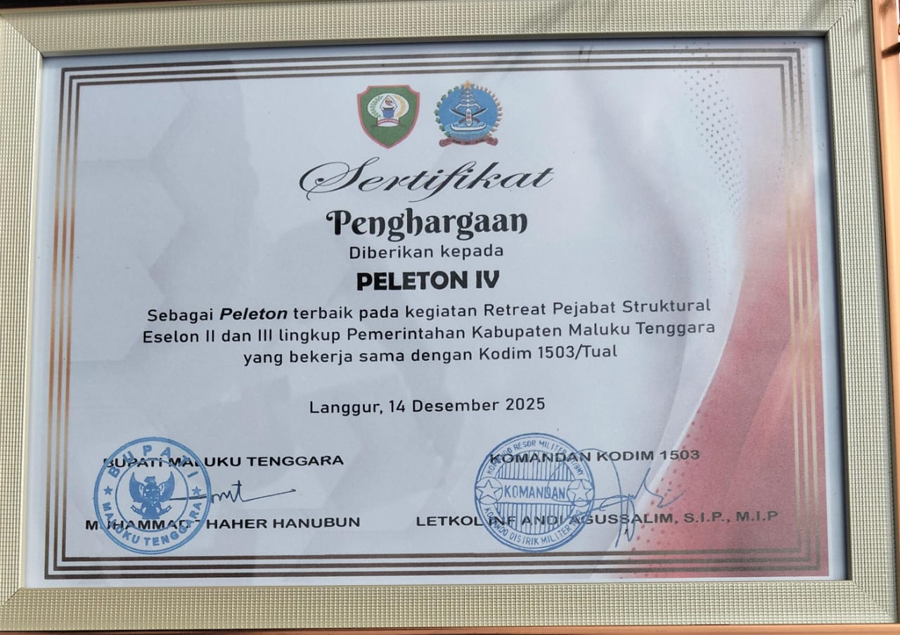 Tual Beritalaser. PELETON 4 Menjadi yang TERBAIK “SERTIFIKAT PENGHARGAAN BUPATI & KOMANDAN KODIM 1503” Retret Pejabat Eselon 2, Eselon 3 ASN Lingkup Kabupaten Maluku Tenggara